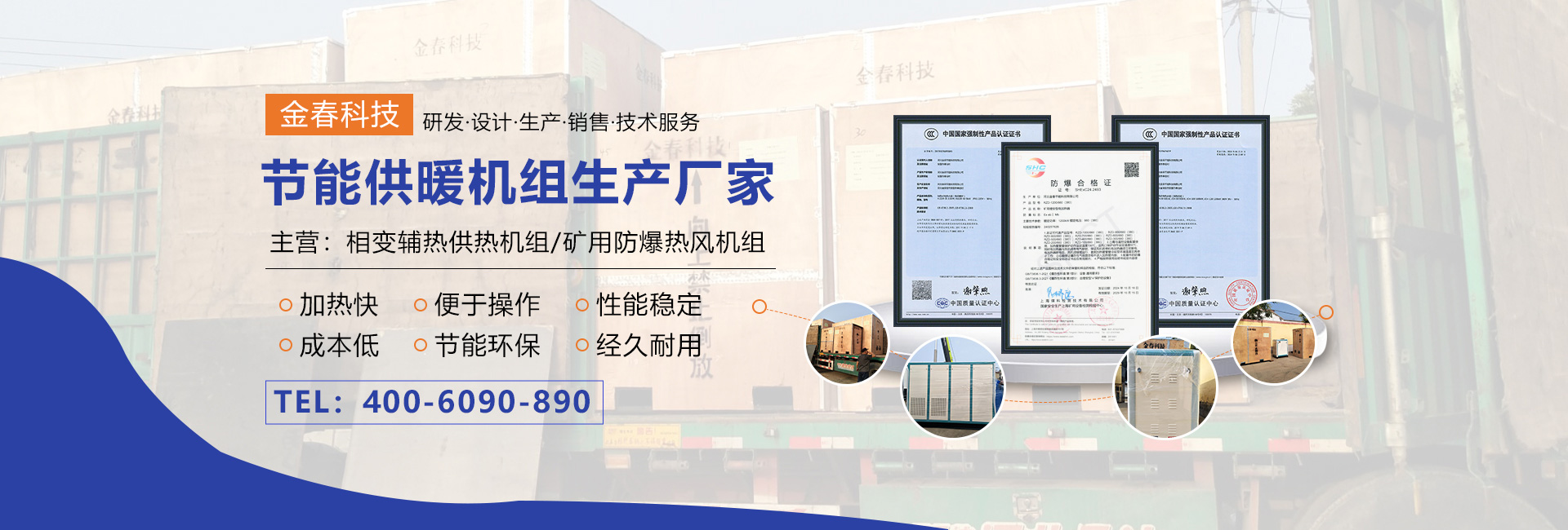 本公司專業(yè)生產相變輔熱供熱機組、礦用防爆熱風機組,可代替燃煤、燃油、燃氣鍋爐,運行成本低,具有加熱快、熱效率高、便于操作,節(jié)能環(huán)保等特點,是新一代理想的環(huán)保節(jié)能產品。